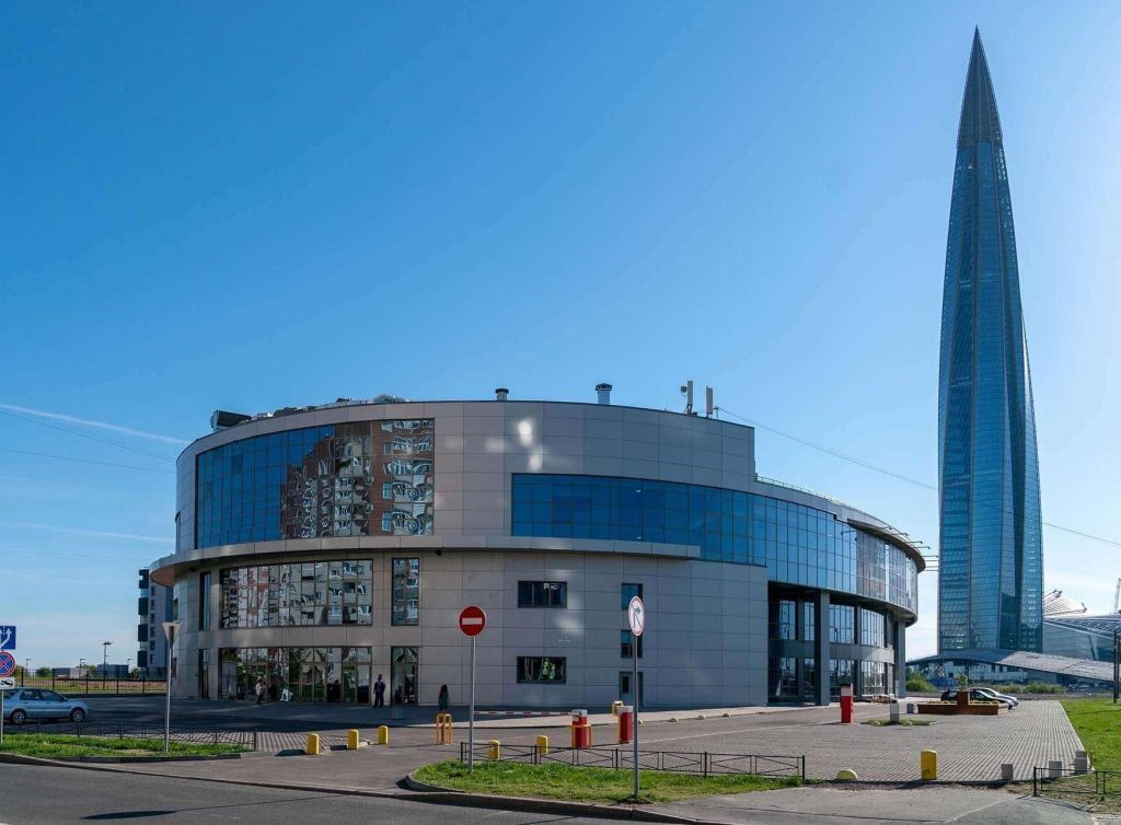 Современная концертная площадка на берегу Финского залива с панорамным видом на Лахта Центр.