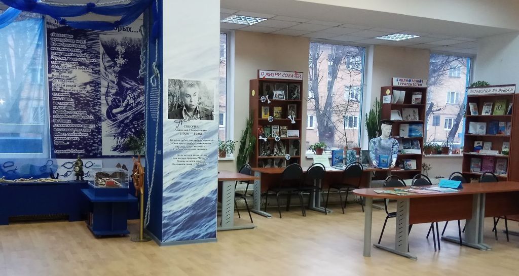 Библиотека открылась в 1973 году, в 2011 году ей было присвоено имя российского писателя А. П. Соболева, на фасаде здания библиотеки установлена мемориальная доска работы скульптора В. Ковалева. В 2016 году в библиотеке создано музейное пространство «Якорей не бросать». В ее структуре два абонемента (для младшего и старшего возраста) и два читальных зала (для младшего и старшего возраста).