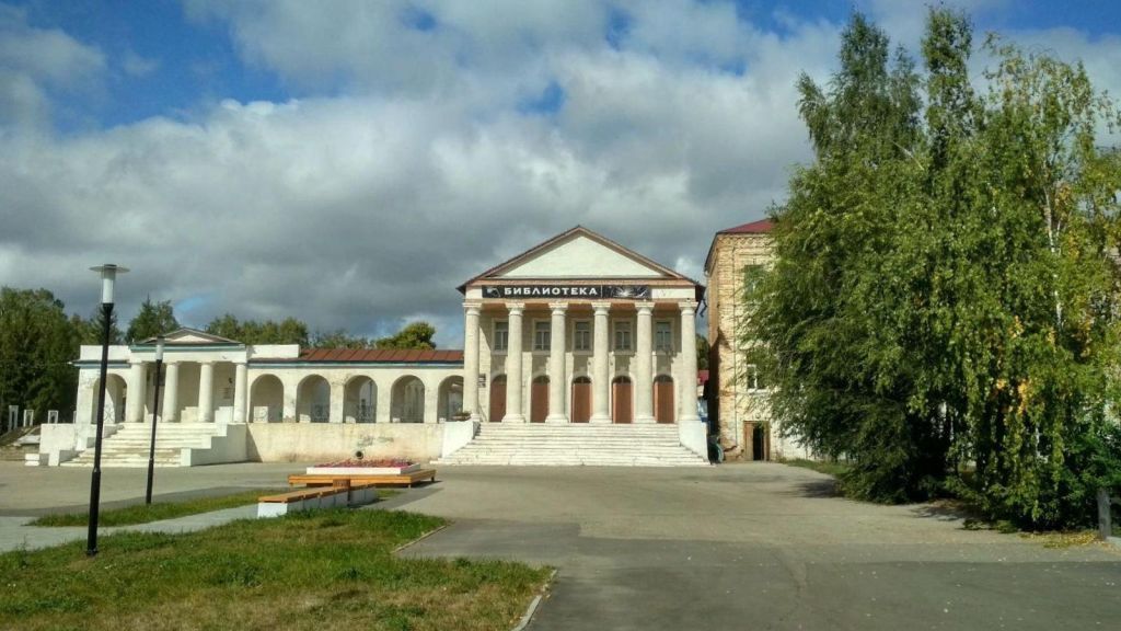 С 1990 года библиотека занимает одно из красивейших зданий поселка – центральное помещение архитектурного ансамбля «Торговые ряды», построенного в 1834 году по проекту известного архитектора Михаила Петровича Коринфского. Здание имеет статус памятника регионального значения.