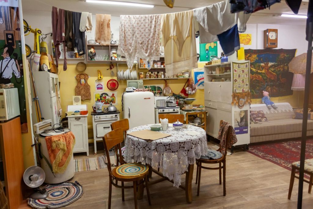 Интерьер залов создает обстановку времен Советского Союза: бело-красные стены, символы СССР, портреты, предметы быта. Все это позволяет полностью окунуться в прошлое. Практически все экспонаты, за исключением особо хрупких, можно потрогать, послушать, примерить и применить на деле. Тысячи экспонатов, среди которых радиотехника, бытовые приборы, кухонная утварь, мебель, одежда, игрушки, косметика и многое другое.