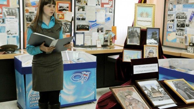 В день торжественного открытия ОмГУ была организована первая экспозиция, состоящая из двух отделов: в первом были представлены материалы, рассказывающие о рождении, первых шагах, становлении университета, а стенды второго посвящались этнографии народов Сибири.