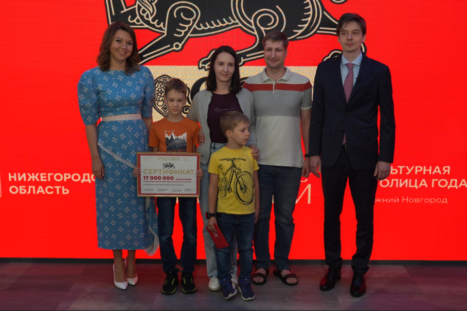 26 июня на международной выставке-форуме «Россия» встретили 17-миллионного посетителя. Им стал Егор Морозов из Волгограда. Он приехал на выставку вместе со своей супругой Ольгой и двумя детьми: шестилетним Андреем и девятилетним Иваном. Им вручили сертификат на трехдневное путешествие в Нижегородскую область.