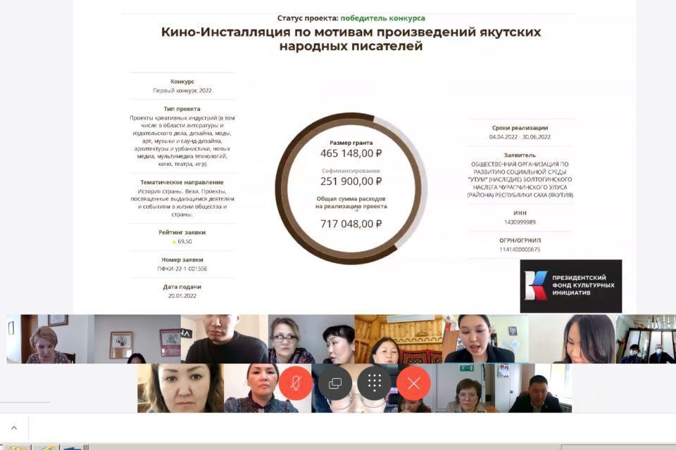 Победители конкурса — активистка Общественной организации «Утум» Чурапчинского улуса Диана Павлова и Николай Апросимов рассказали о своих проектах: «Кино-инсталляция по мотивам произведений якутских народных писателей», посвящённом выдающимся деятелям и событиям в жизни общества и страны, и «AYANA – электронный переводчик для мгновенного перевода эвенкийского языка на основе скрипта с функцией правки для носителя языка».