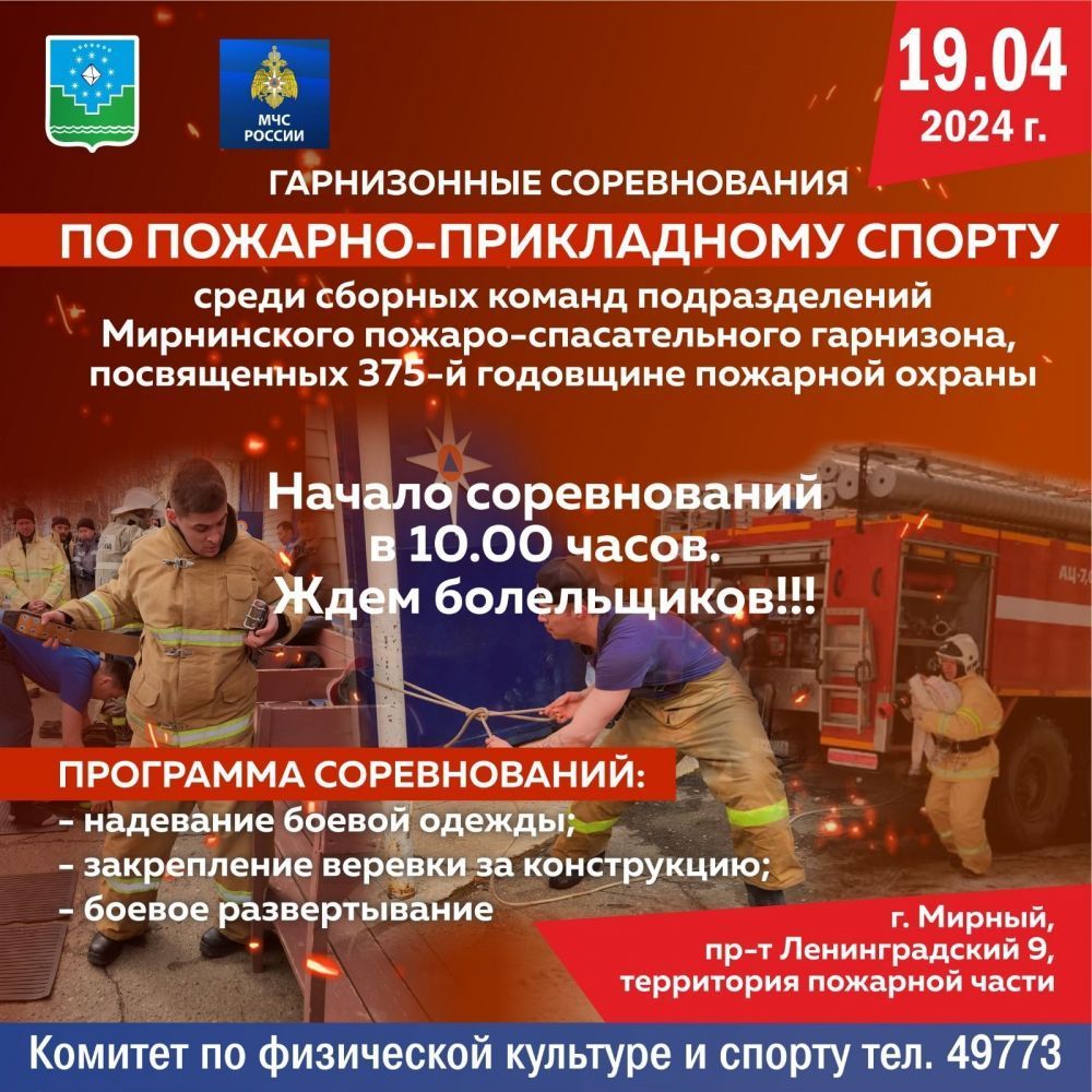 19 апреля в 10 часов в городе Мирный на территории пожарно-спасательной части № 1 по Ленинградскому проспекту состоятся гарнизонные соревнования по пожарно-прикладному спорту среди сборных команд подразделений Мирнинского пожарно-спасательного гарнизона, посвященные 375-й годовщине пожарной охраны России.