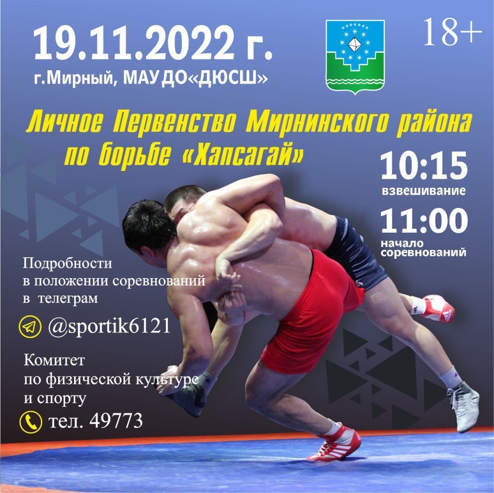 19 ноября в ДЮСШ состоится личное первенство Мирнинского района по борьбе «хапсагай». В 10 часов - мандатная комиссия, в 11 - начало соревнований.