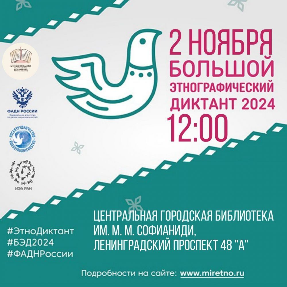 "Народов много – страна одна!» - под таким лозунгом с 1 по 8 ноября пройдет IX Международная просветительская акция «Большой этнографический диктант».Проект знакомит с культурой народов, проживающих в России и позволяет оценить уровень этнокультурной грамотности. Организатор - Федеральное агентство по делам национальностей.