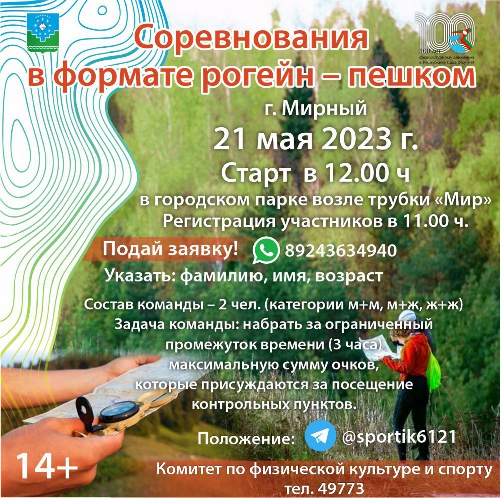 21 мая в г. Мирный в 12 часов около трубки «Мир» в городском парке состоится старт соревнований в формате рогейн – пешком/бегом.