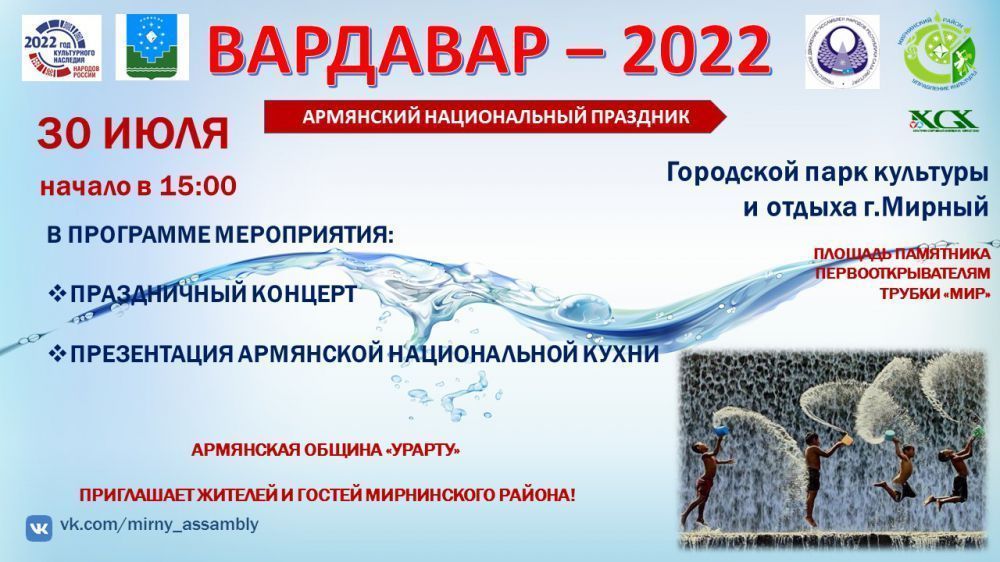 Армянская община "Урарту" приглашает жителей и гостей алмазной столицы на армянский национальный праздник Вардавар 30 июля с 15 часов в городской парк культуры и отдыха г. Мирный. Мероприятия пройдут на территории площади памятника первооткрывателям трубки "Мир".