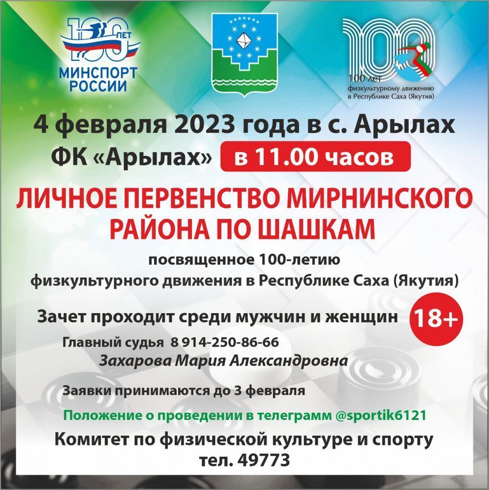 4 февраля в физкультурном комплексе «Арылах» с. Арылах состоится личное первенство Мирнинского района по шашкам, посвященное