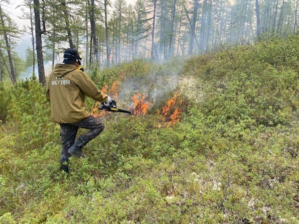 Второй лесной пожар – в 55 км от с. Сюльдюкар. На месте работают два сотрудника «Якутлесресурса» и один местный житель.