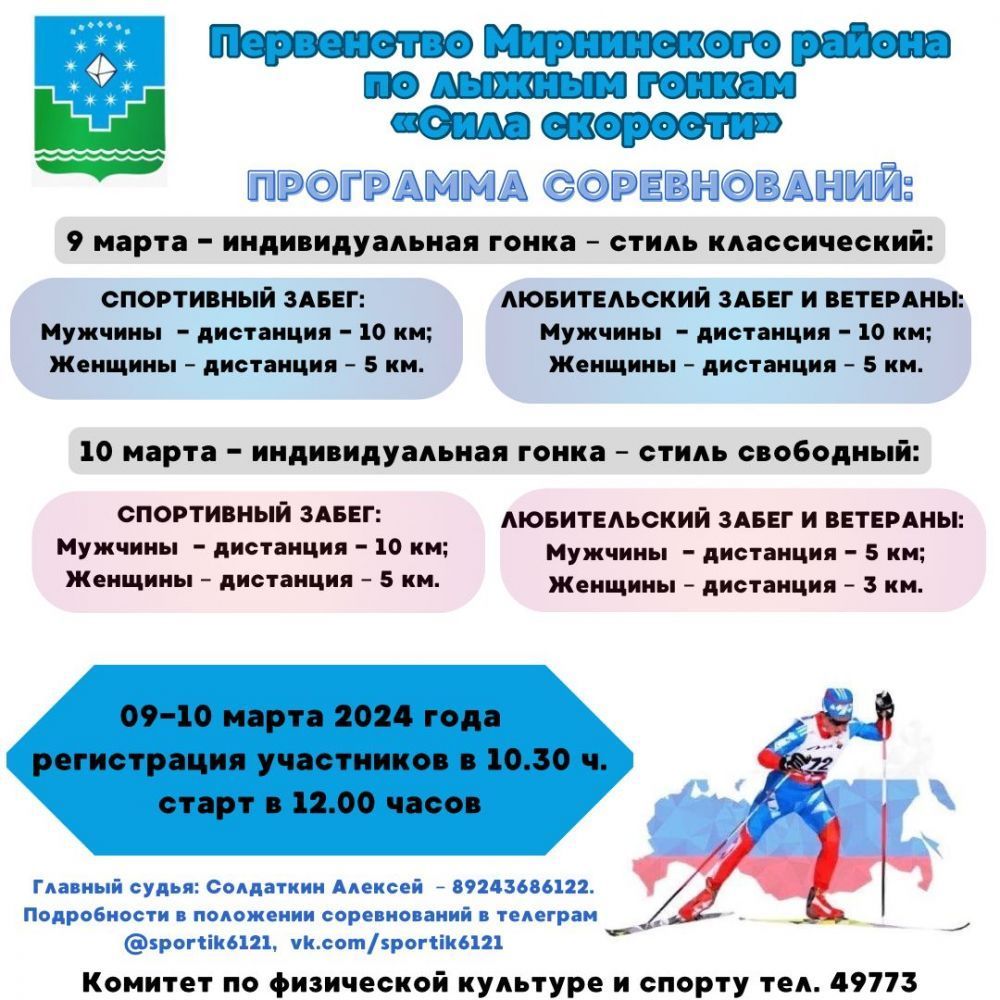 9-10 марта на лыжной базе «Заречная» состоится первенство Мирнинского района по лыжным гонкам «Сила скорости».