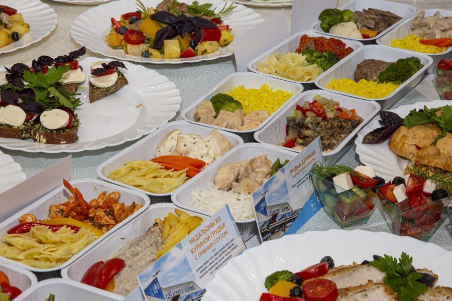 Всего более ста видов горячих блюд с курицей, рыбой и мясом, а также большое разнообразие соусов, салатов, закусок, кондитерских изделий и десертов было представлено на презентации нового ассортиментного перечня осенне-зимнего периода 2019-2020 гг. Представители авиакомпаний-партнеров продегустировали новые блюда, в дальнейшем каждая авиакомпания решит, чем угощать своих пассажиров, и составит собственное меню.