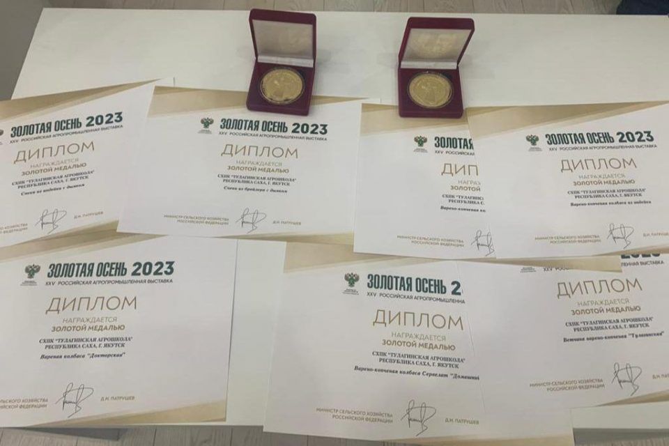 Семь золотых медалей получила Тулагинская агрошкола из Якутска за вареную колбасу «Докторская», варено-копченую колбасу «Сервелат домашний», варено-копченую колбасу из бройлера, варено-копченую колбасу из индейки, ветчину варено-копченую «Тулагинская» и за снеки из бройлера с дымком (два вида).