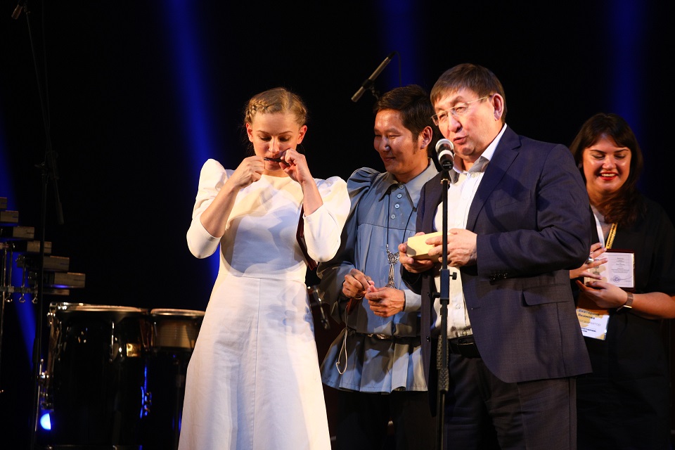 «Помимо памятного знака также хочется вручить замечательной и храброй актрисе Юлии Пересильд, которая, как все мы знаем, побывала в космосе, наш якутский хомус. Считается, что он издаёт космические звуки, а однажды Якутии удалось отправить наш варган в космос. Якутия ждёт, что, когда у Юлии будет творческий порыв, наш хомус зазвучит в новых её спектаклях», — сказал министр.