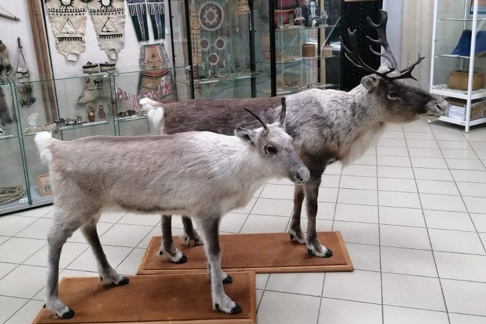 Чучела оленей установлены в этнографическом зале, экспозиции которого рассказывают о жизни и быте эвенков.