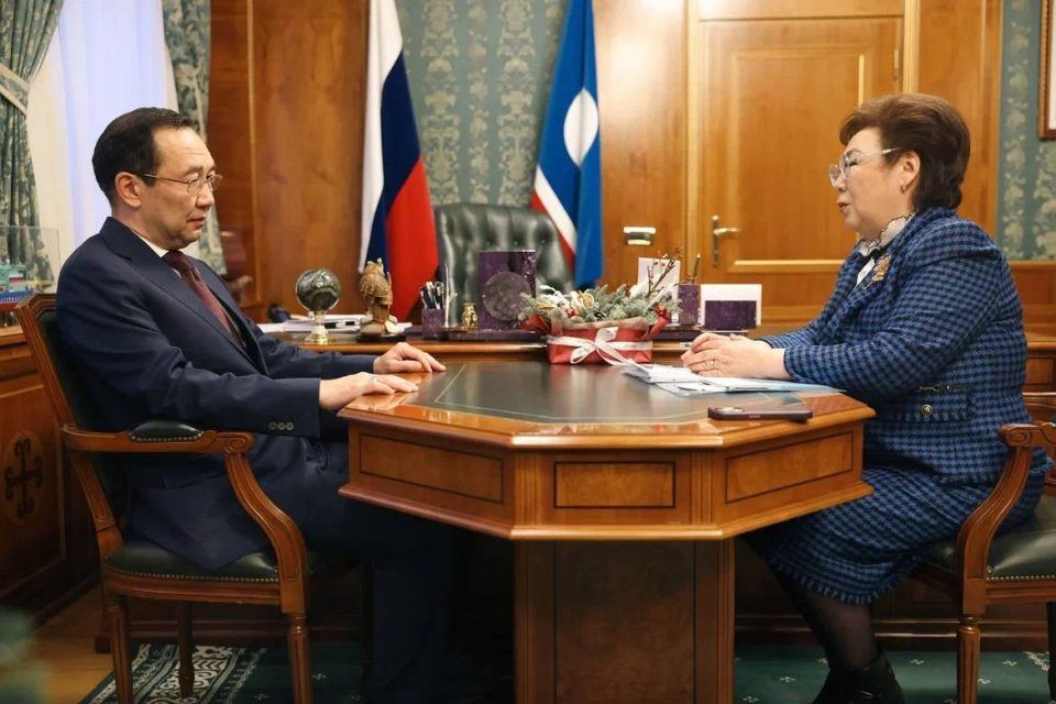 Глава Якутии провел рабочую встречу с руководителем Центра изучения, сохранения и развития родных языков Академии наук РС (Я) Феодосией Васильевной Габышевой.