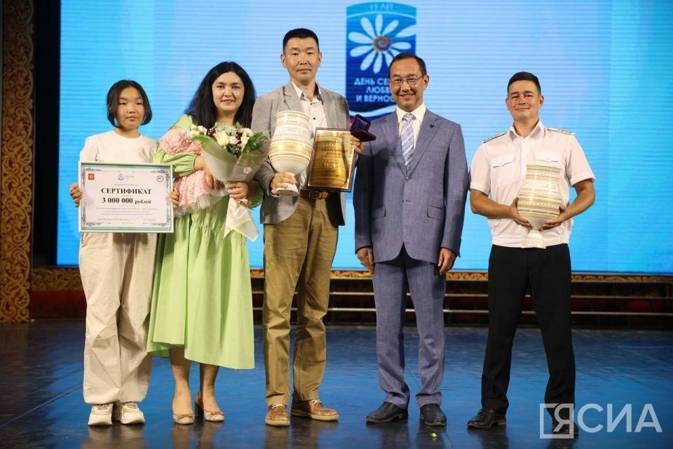 Сегодня на фестивале «Семья года» глава Якутии Айсен Николаев вручил семье миллионного жителя республики Саины Онуфриевой из Мирнинского района сертификат на три миллиона рублей.