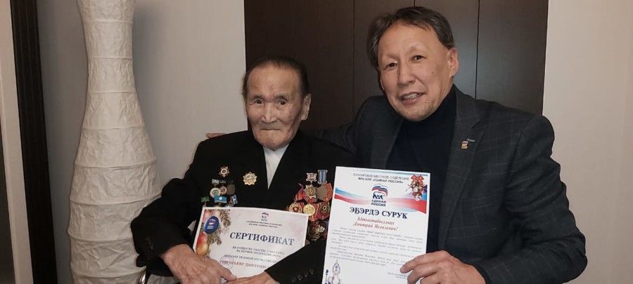 Во время визита, в знак глубокого уважения, от имени партии Петру Терентьевичу были вручены приветственный адрес и подарок с наступающим Новым годом – годом 75-летия Великой Победы над фашисткой Германией. В свою очередь ветеран живо интересовался новостями родного улуса, проявлял большой интерес к происходящим переменам в обществе.