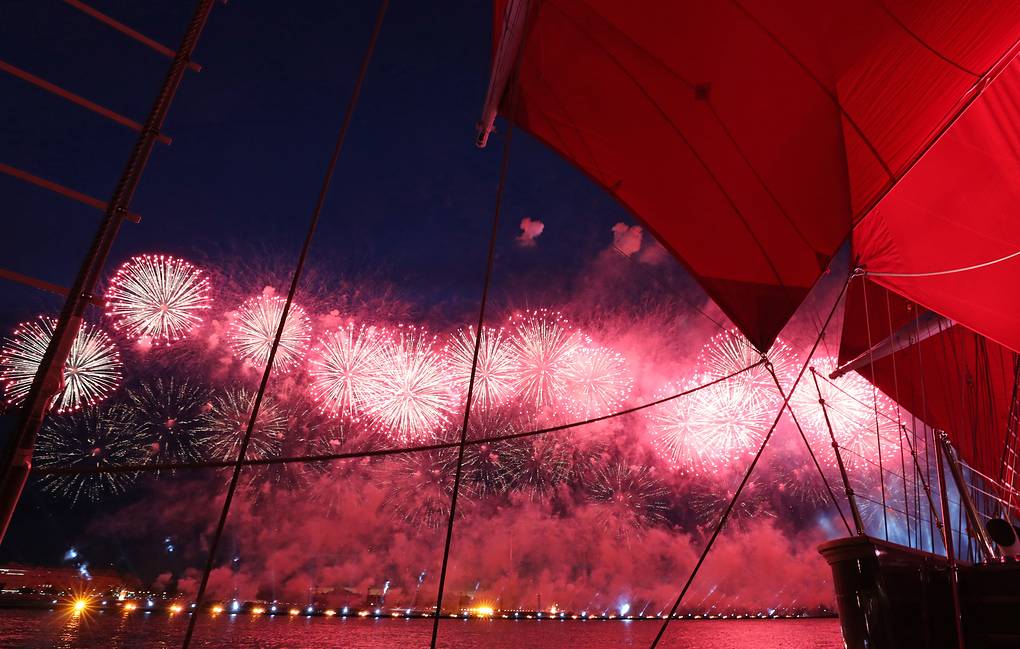 Размер главного символа корабля — алых парусов — около 900 квадратных метров — это примерно две баскетбольные площадки. Канонада в небе над Петербургом длилась 22 минуты, но праздник не закончился — школьники будут гулять до рассвета.