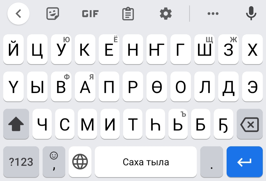 Единственная бесплатная клавиатура на якутском языке для пользователей AppStore. Клавиатура представлена в двух видах раскладки: сокращённой и расширенной. В первом варианте якутские буквы «Ү, Ө, Һ, Ҥ, Ҕ» скрыты за русскими: Ү за У, Ө за О, Һ за С, Ҥ за Н, Ҕ за Г И Х. Для этого следует нажать и удерживать соответствующие клавиши. В расширенном варианте якутские буквы расположены отдельным рядом над русской клавиатурой.