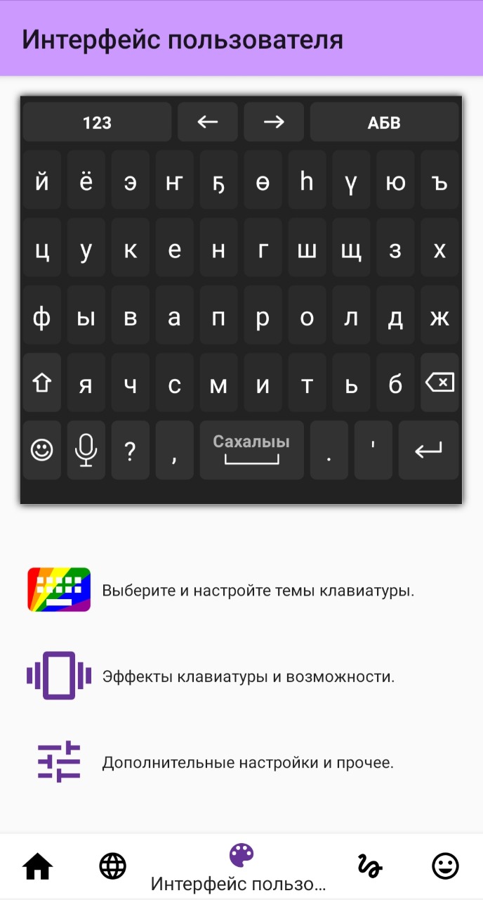 По сути, ничем не отличается от клавиатуры Яндекс. Разве что, нет поисковика. Единственное что смущает, это то, что на якутской раскладке некоторые русские буквы скрыты за другими и чтобы их ввести, нужно зажимать кнопку.