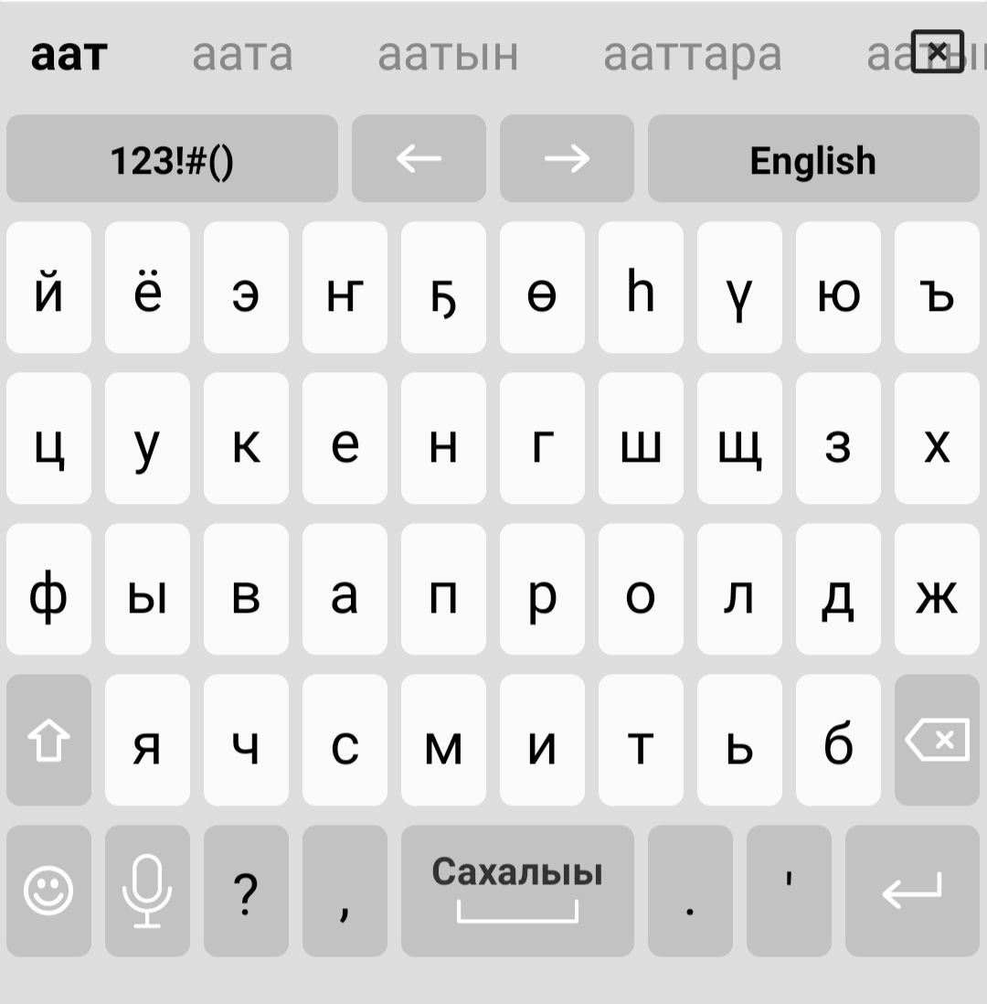 Для работы с этой клавиатурой сперва нужно скачать приложение самой клавиатуры (AnySoftKeyboard) и отдельно от неё пакет якутской раскладки (Сахалыы клавиатура) с PlayMarket. Данная клавиатура представлена в 4 вариантах: “Сахалыы”—якутские буквы находятся над русскими в стиле Windows; “Өыэртү”—русские буквы которых нет в якутском языке скрыты под якутскими (Ө-Ё, Э-Е, П-Ф, А-Я, С-Ш-Щ, Ҕ-Ф, Г-Ж, Ь-З-Ъ, Ч-Ц, Б-В); “Нууччалыы”—якутские буквы скрыты под русскими (Н-Ҥ, Г-Ҕ, О-Ө, С-Һ, Ю-Ү); “Һөҕүҥ”— якутские буквы находятся над русскими.
