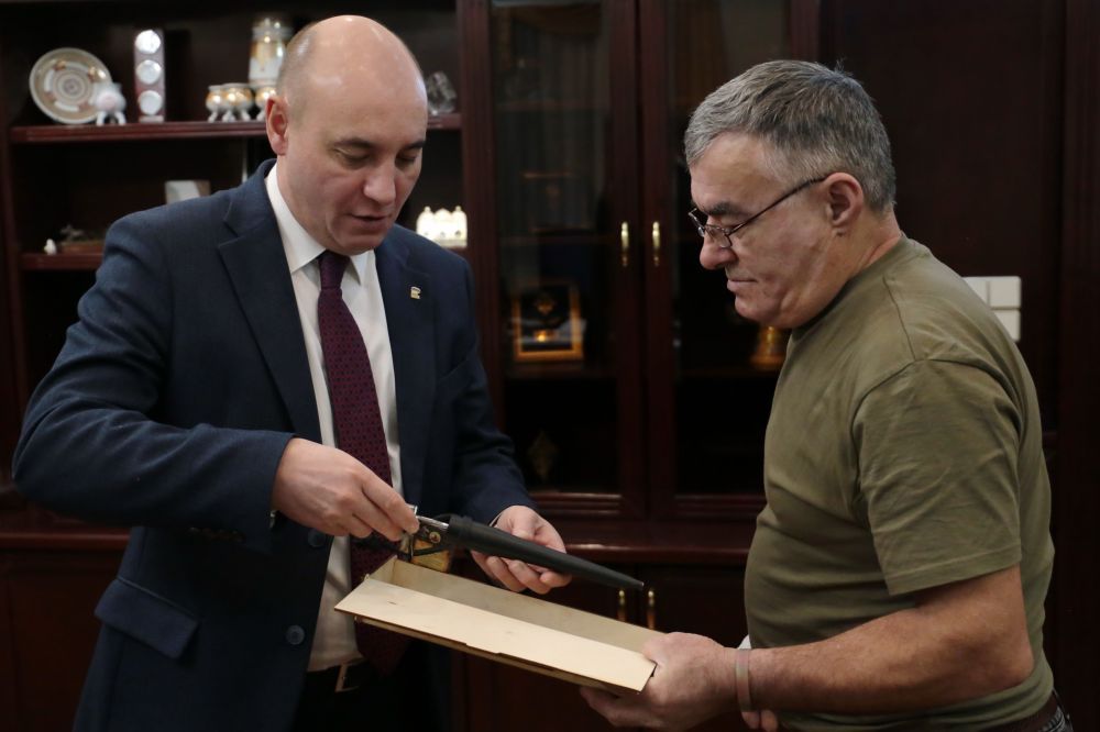 Пожалуй, он на сегодня самый возрастной солдат, которого мы встречали. Через пару дней Шамилю исполнится 63 года. Накануне дня рождения Александр Басыров вручил бойцу традиционный якутский клинок с памятной надписью.