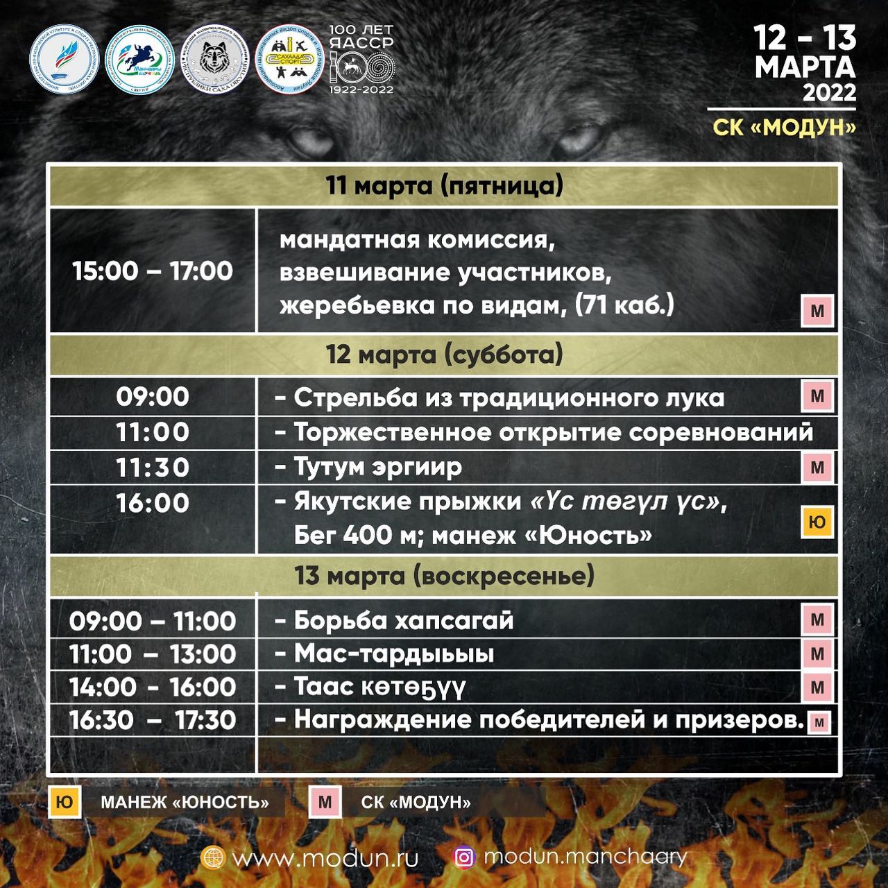 В этом году внесены изменения в правила проведения турниров по национальному многоборью — если раньше в стрельбе выбирали любой лук, в том числе классический, то теперь разрешен только якутский традиционный лук. Первым видом соревнований чемпионата станет именно стрельба из лука, затем тутум эргиир, якутские прыжки «ус тегул ус», бег на 400 метров. Во второй день ожидаются все два единоборства — хапсагай и мас-рестлинг, а завершится чемпионат перетаскиванием камня.