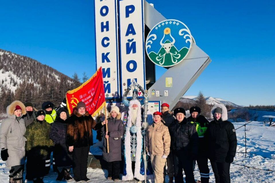 Делегации Томпонского и Оймяконского районов, возглавляемые заместителями глав по социальным вопросам Оксаной Назаренко и Прасковьей Аммосовой, встретились на границе двух территорий для передачи символа Победы.