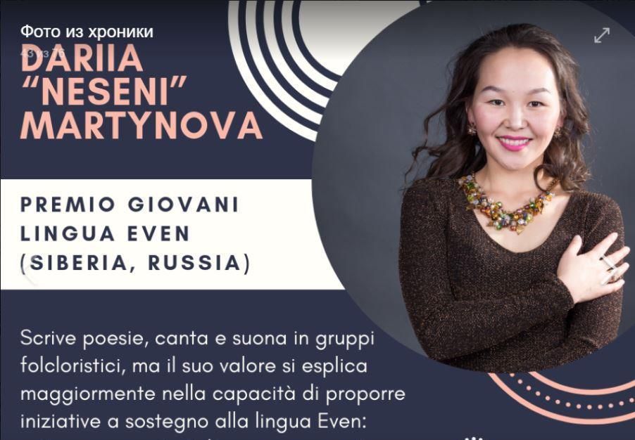 Во время церемонии вручения Дария читала стихи на эвенском языке, а переводчик — на итальянском. «Очень благодарна переводчикам и организаторам за возможность моим стихам увидеть свет на итальянском языке. Итальянцы очень эмоционально на них реагировали», — сообщила Мартынова.