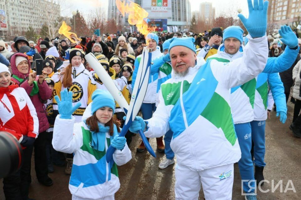 Финишировала эстафета у ледового дворца «Кузбасс», где через несколько часов состоится церемония открытия игр.