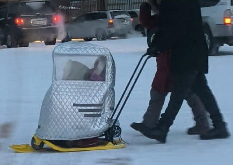 В мессенджерах активно распространяется фото находчивых родителей, которые сшили портативный гаражик для санок или снегохода, чтобы с комфортом и в тепле отвозить детей в садик.