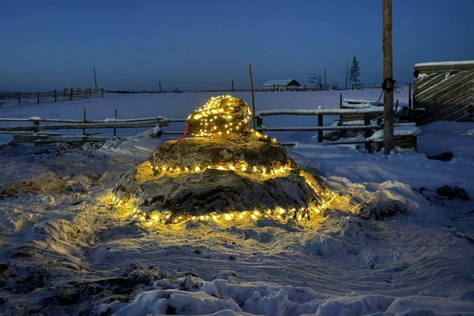 Молодой фермер из Горного района Якутии вылепила из навоза символ 2025 года — Змею. Свою работу автор украсила гирляндами. Об этом сообщили в районной газете «Улэ кууьэ (Сила труда)».