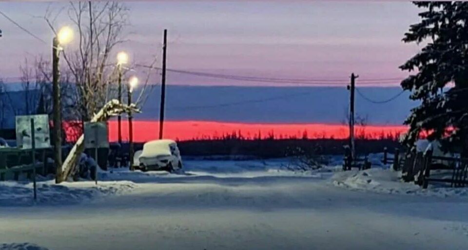 Жители села Новый Томпонского района Якутии сегодня наблюдали необычный закат, сообщается на инстаграм-странице газеты «Томпонский вестник». Солнце попрощалось, окрасив небо, горизонт и реку в цвета российского флага.
