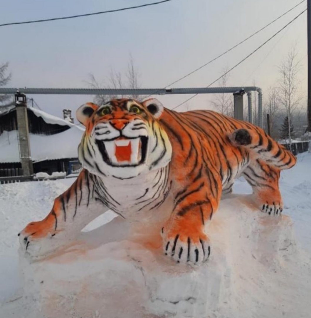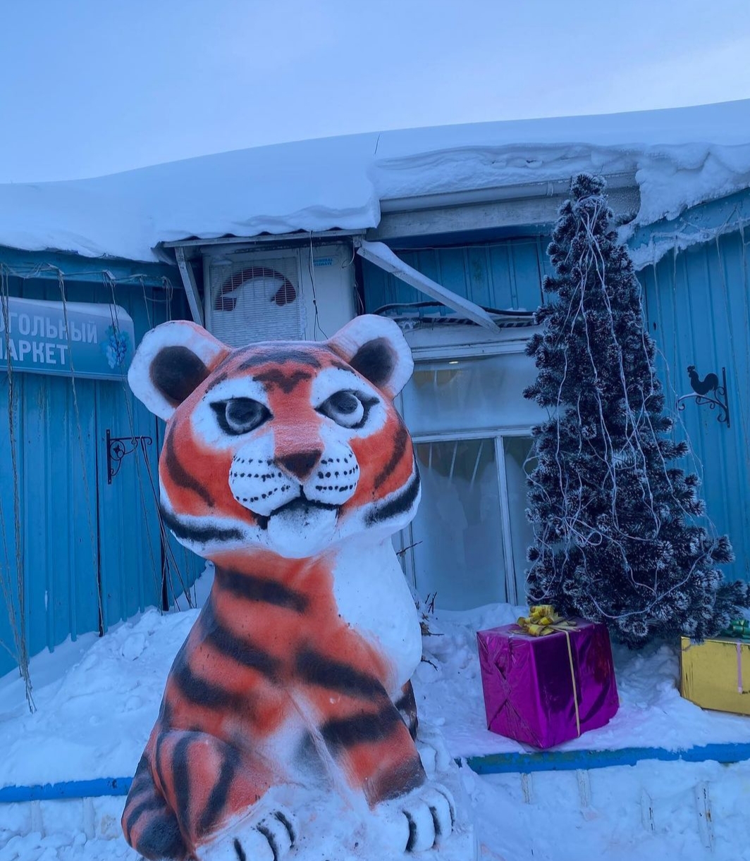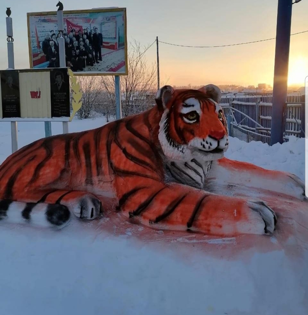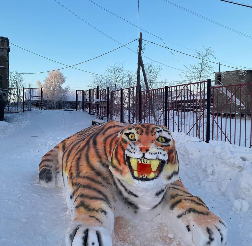 В преддверии Нового года во дворе администрации города Покровска Хангаласского улуса появился новый обитатель – пПокровский тигр, как его называют сами жители. Изваял огромную фигуру из снега работник администрации Сергей Иванов.