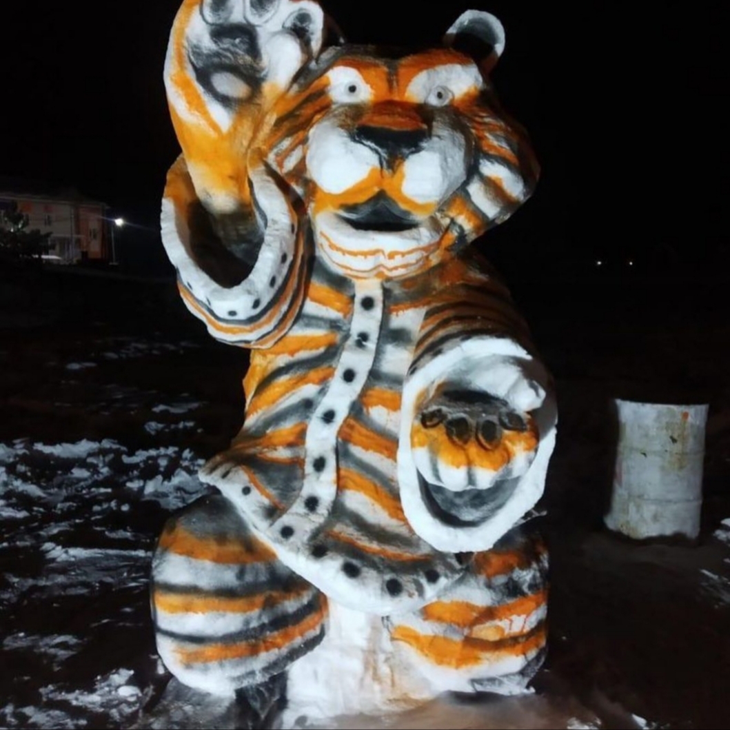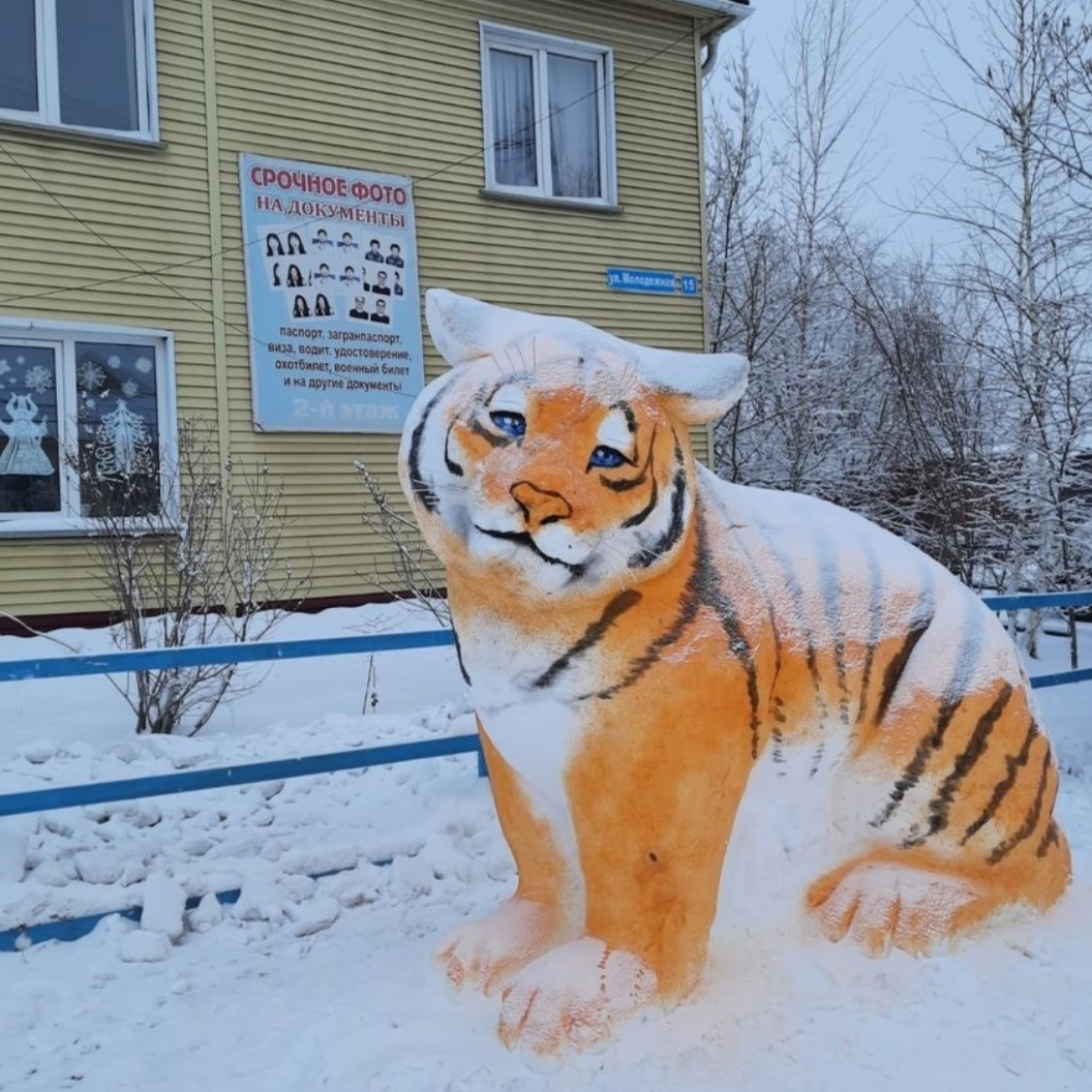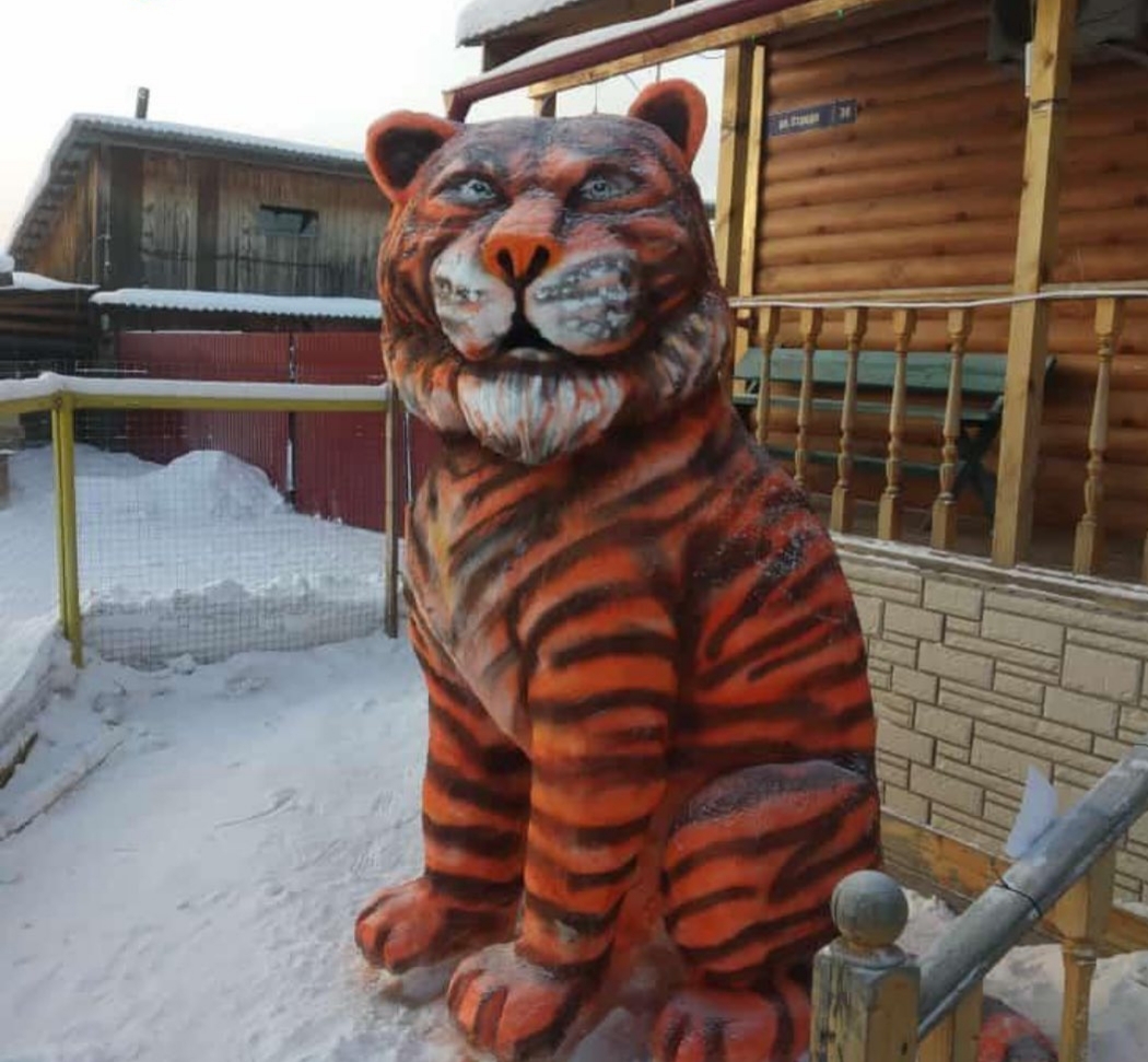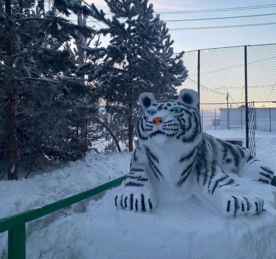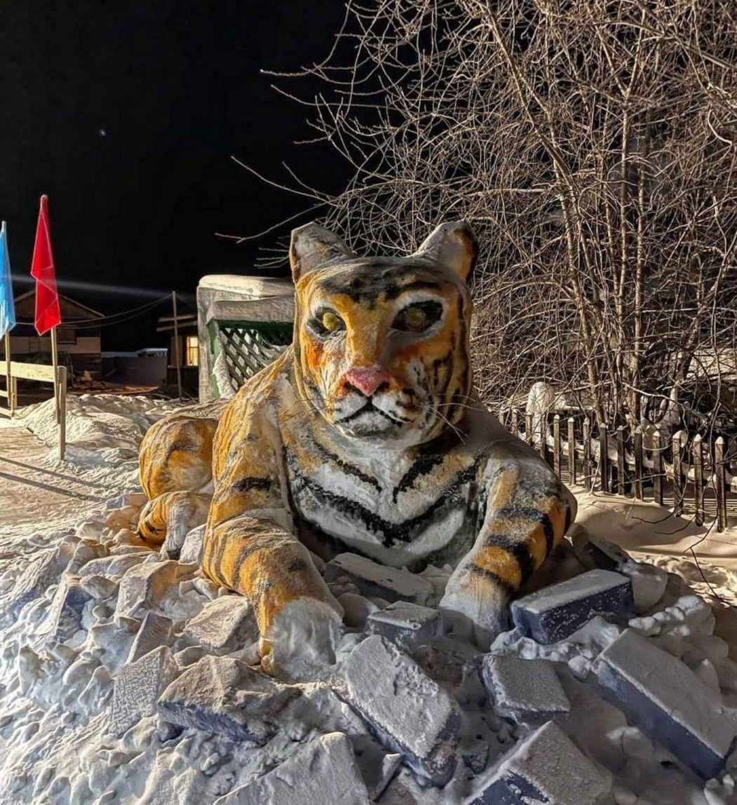 В преддверии Нового года во дворе администрации города Покровска Хангаласского улуса появился новый обитатель – пПокровский тигр, как его называют сами жители. Изваял огромную фигуру из снега работник администрации Сергей Иванов.