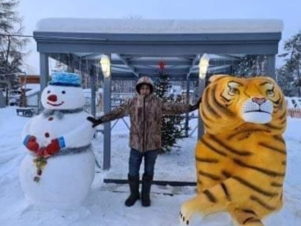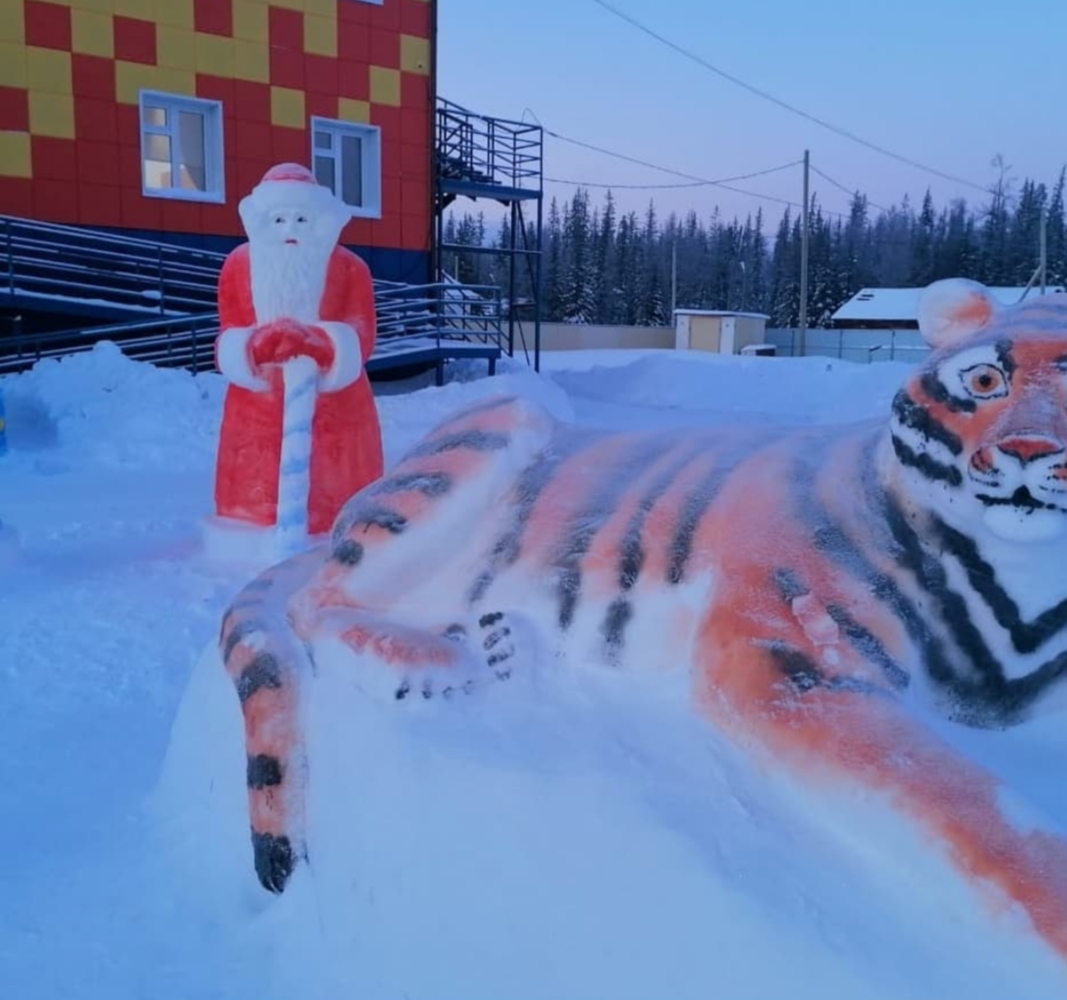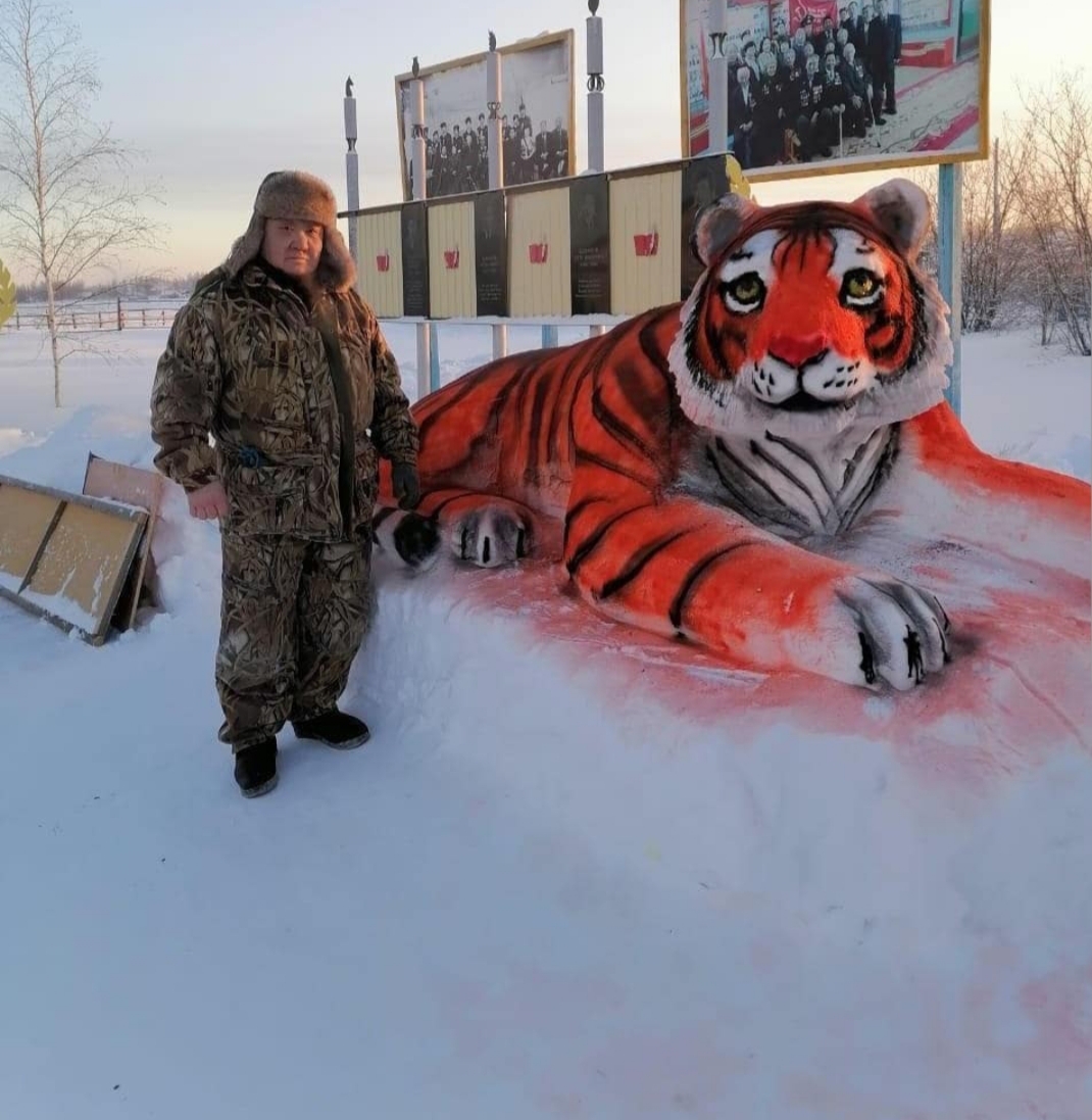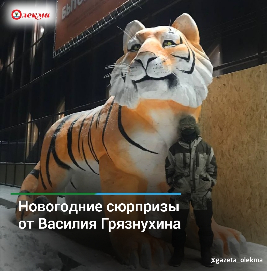 В преддверии Нового года во дворе администрации города Покровска Хангаласского улуса появился новый обитатель – пПокровский тигр, как его называют сами жители. Изваял огромную фигуру из снега работник администрации Сергей Иванов.