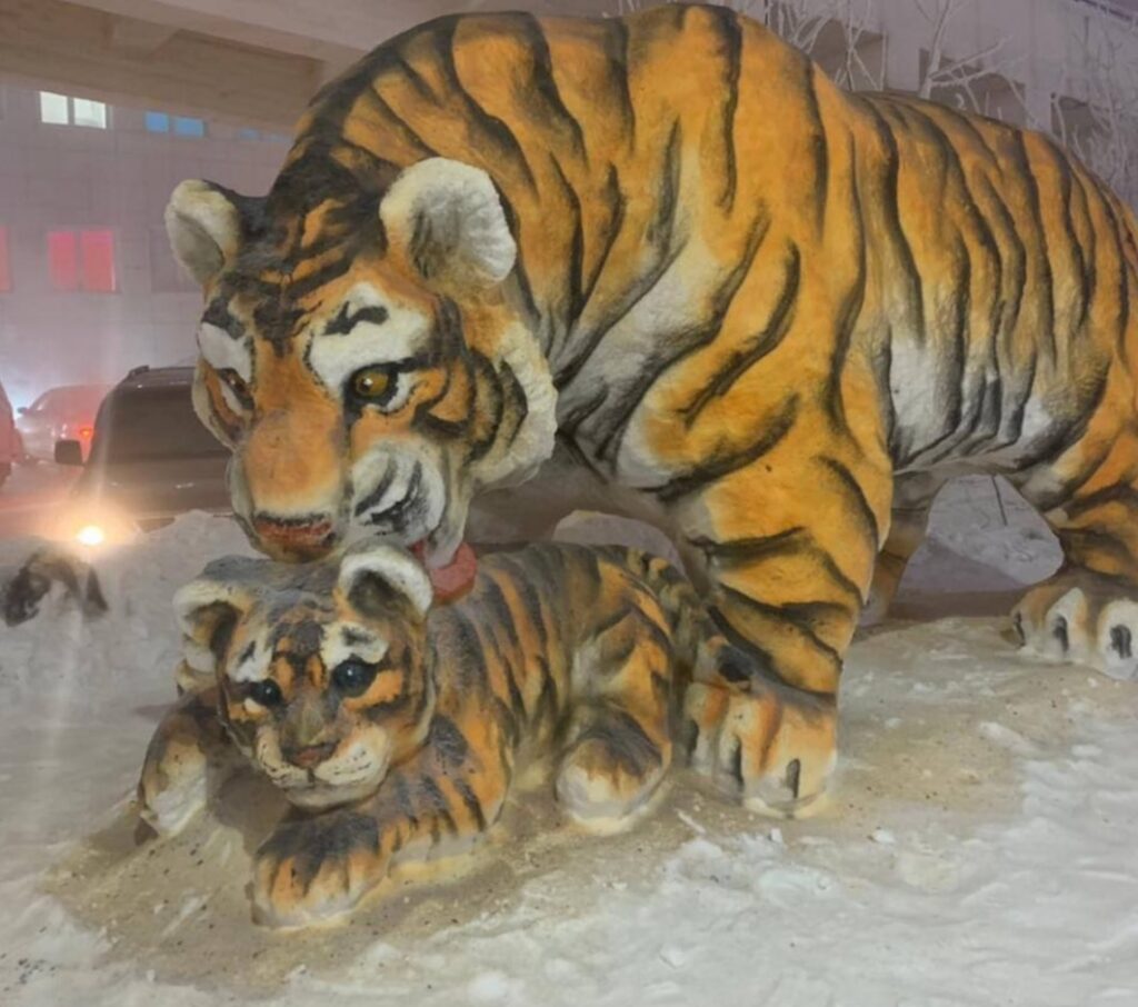 Кобяйский улус украшает внушительный и очень правдоподобный тигр, автором которого является Степан Эверстов. А этих белого тигра и тигренка сделал Яков Сметанин. Радует детвору озорной тигренок в селе Куокуй от Геннадия Иванова. Еще один тигр находится у Сангарской школы. Большого и мощного тигра создал Степан Кривошапкин из села Сегян-Кюель.
