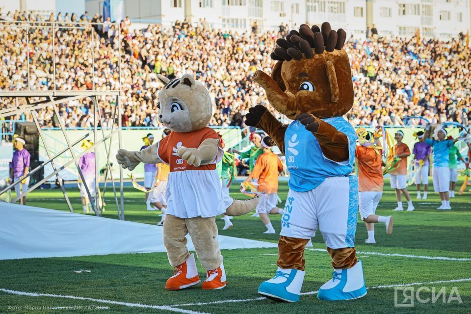 Перед началом торжественной части в окружении акробатов и танцоров на сцену вышли талисманы VIII летних международных спортивных игр «Дети Азии» — мамонтёнок Модун и бурундук Саина. Напомним, имена талисманам выбрали в ходе голосования в соцсетях.