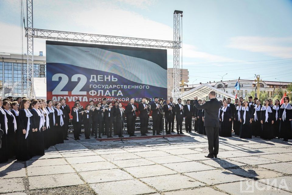 На площади Ленина в Якутске 22 августа сводный хор театра оперы и балета Якутии им. Д. К. Сивцева — Суоруна Омоллоона под аккомпанемент духового оркестра Lena River Brass филармонии республики им. Г. М. Кривошапко исполнил гимн России в День государственного флага страны.