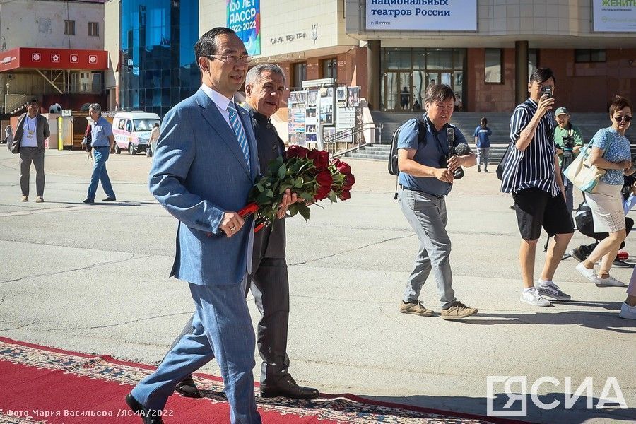 Глава Якутии Айсен Николаев и президент Татарстана Рустам Минниханов возложили цветы к памятнику основоположнику якутской советской литературы и общественному деятелю Платону Ойунскому. Президент Татарстана прибыл в республику сегодня, 24 июня, передает ЯСИА.