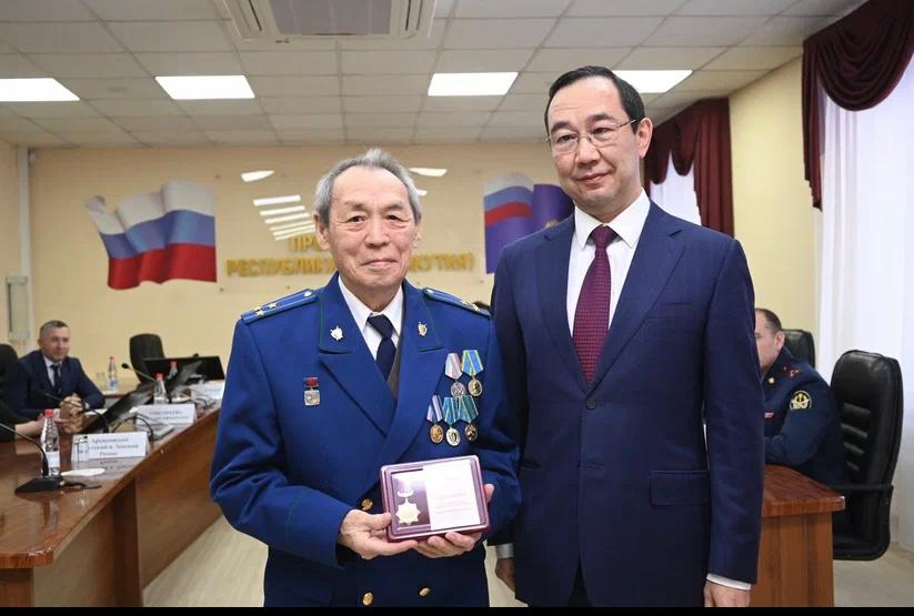 Сегодня в День работника прокуратуры Российской Федерации глава Якутии Айсен Николаев вручил награды ветеранам органов прокуратуры республики. Всего юбилейными медалями «100 лет Якутской АССР» отмечены 11 ветеранов и пенсионеров прокуратуры.