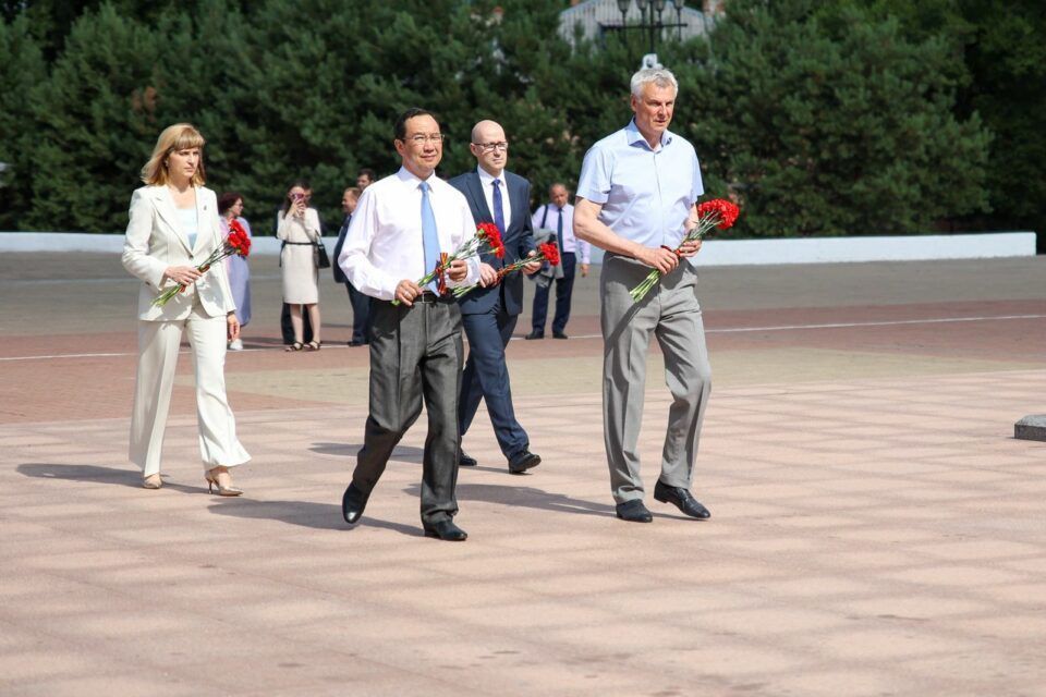 Сегодня утром Айсен Николаев вместе с губернатором Магаданской области Сергеем Носовым возложил цветы к Вечному огню мемориала Славы.