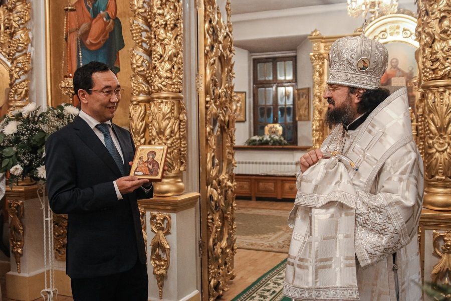 В своем выступлении Айсен Николаев отметил значимость великого праздника и вручил Архиепископу Якутскому и Ленскому икону Пресвятой Богородицы.