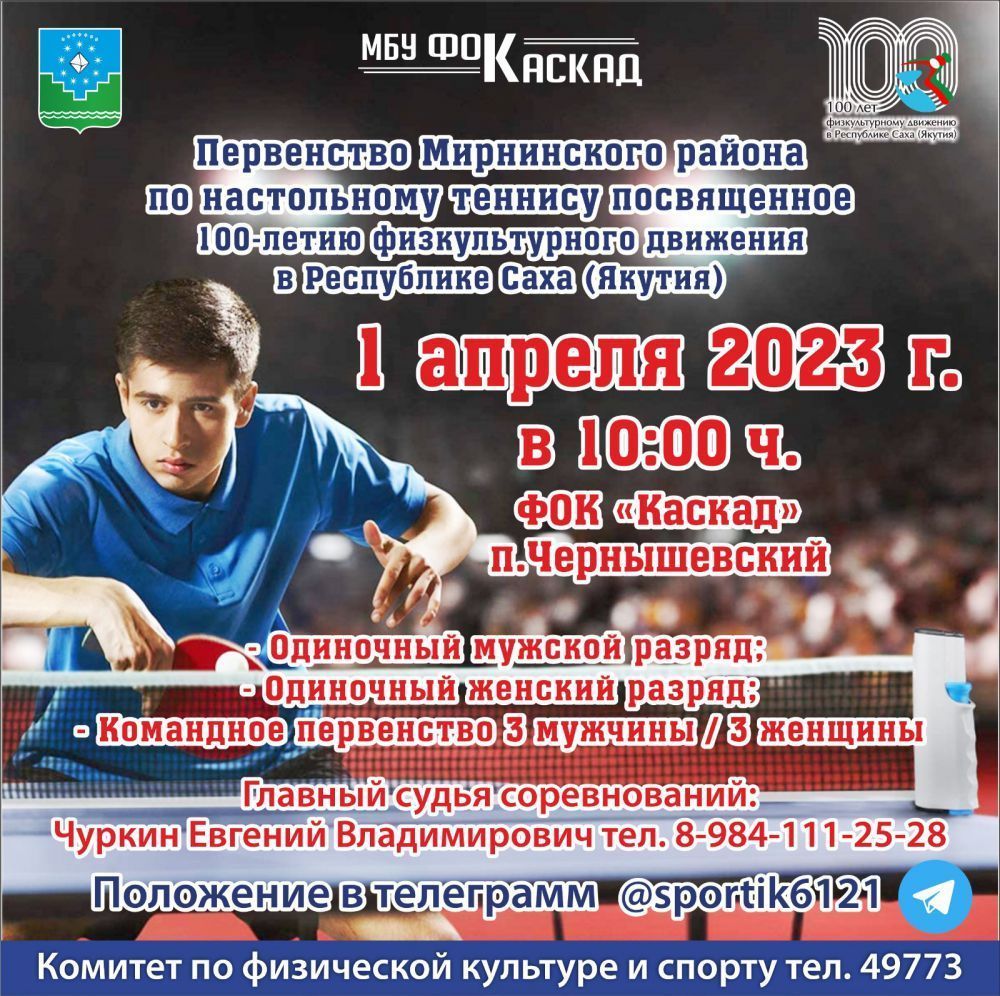 1 апреля состоится первенство Мирнинского района по настольному теннису, посвященное 100-летию физкультурного движения в Якутии.