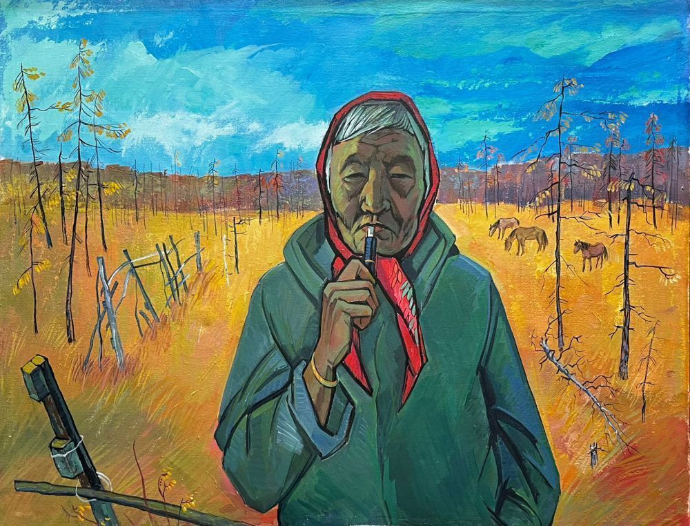 Хочется уделить особое внимание одному портрету, где идет по осеннему лесу бабушка Петрова Ксения Аввакумовна, которой на тот момент исполнилось 92 года. Реальная бабушка из реалий современности, жительница микрорайона Заречный, держит на руке устройство для нагревания табака «Айкос» и спокойно прогуливается на природе (настоящий эпизод из жизни). Этим художник стремился показать, как несмотря на суровые условия и тяжелую жизнь в Якутии, люди становятся долгожителями. Твердость характера, терпение и закалка читается в образе героини. Художник умело создал арт-портрет, интерпретировал игру света и тени - этот стиль отличают от классической техники живописи сочные и яркие цвета. Ксения Аввакумовна ушла из жизни 7 января 2022 года, а через 20 дней не стало и самого художника… так они и не поговорили за чашкой чая. Если бы не пандемия, состоялись бы и встреча, и беседа. Рим Ахметович относился к пожилым людям с большим уважением и любовью.