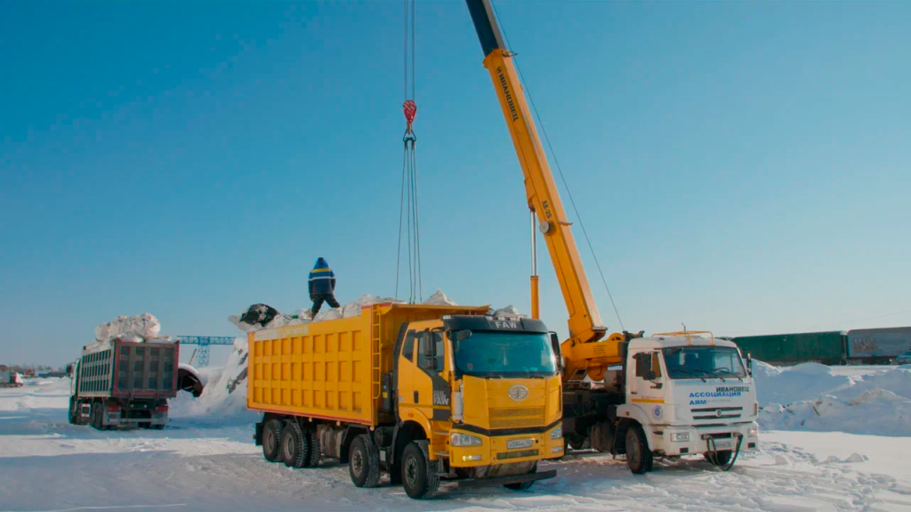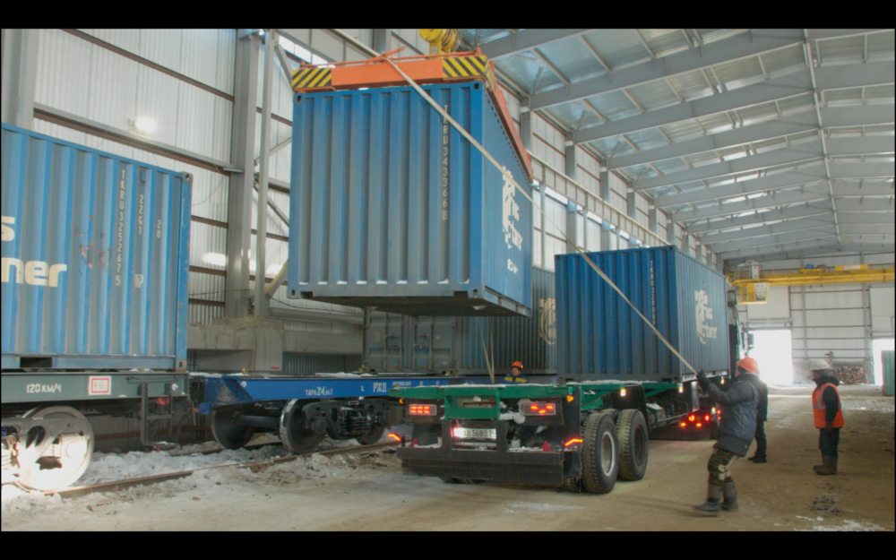 Многотонные автомобили заезжают в ангар под погрузку, здесь контейнеры снимают с железнодорожных платформ и «помогают им устраиваться» на платформы автомобилей. Вся техника готова, работников хватает.