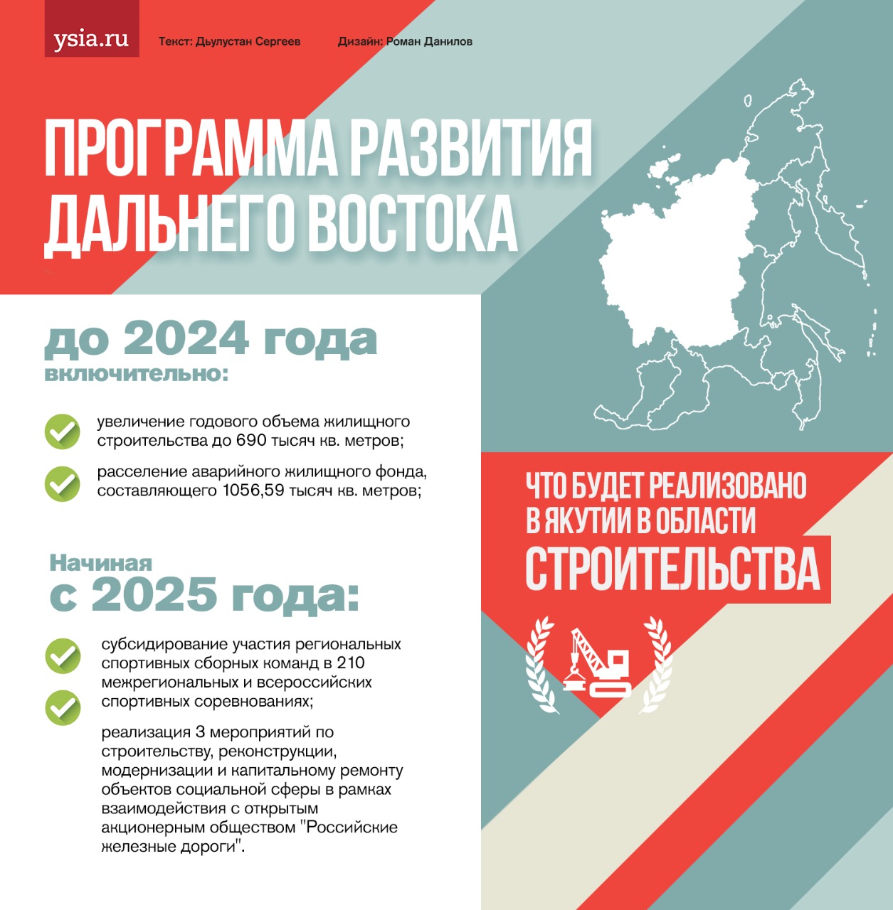 Председатель правительства России Михаил Мишустин подписал программу развития Дальнего Востока, которая предусматривает множество мероприятий, которые будут реализованы и на территории Якутии — это строительство новых учреждений образования, медицины, культуры, спорта, объектов инфраструктуры и экономики. ЯСИА представляет обзор плана, которую реализуют на территории республики.