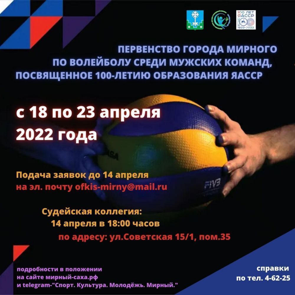 Уважаемые жители алмазной столицы! Приглашаем вас принять участие с 18 по 23 апреля в открытом первенстве города Мирного по волейболу среди мужских команд, посвященном 100-летию образования Якутской АССР.