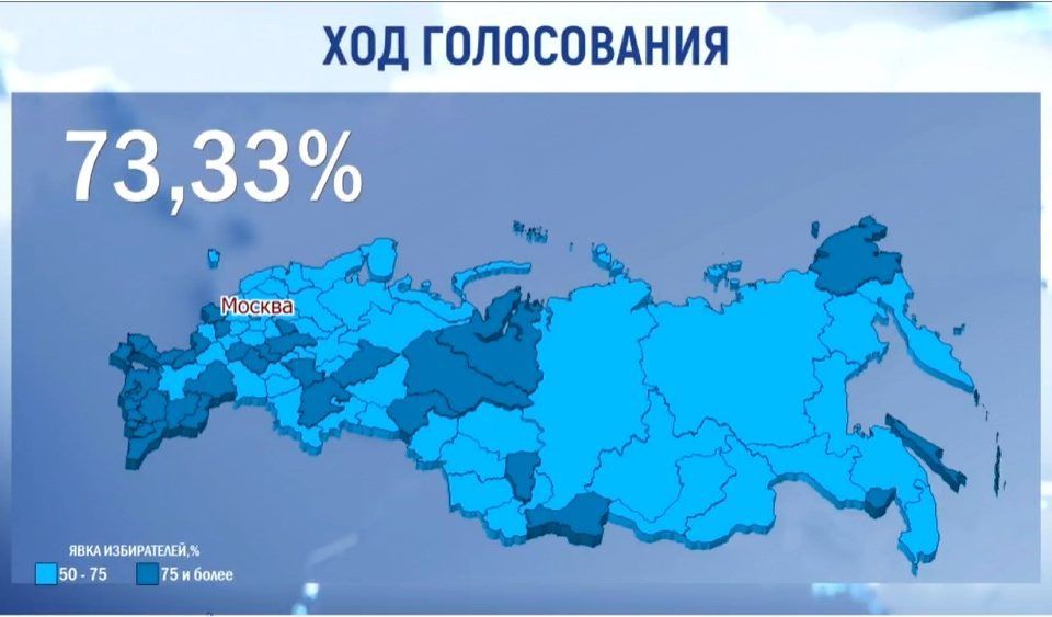 По данным информационного табло ЦИК РФ, общая очная явка на выборах президента России по стране составила 73,33% по состоянию на 20:00 по мск.